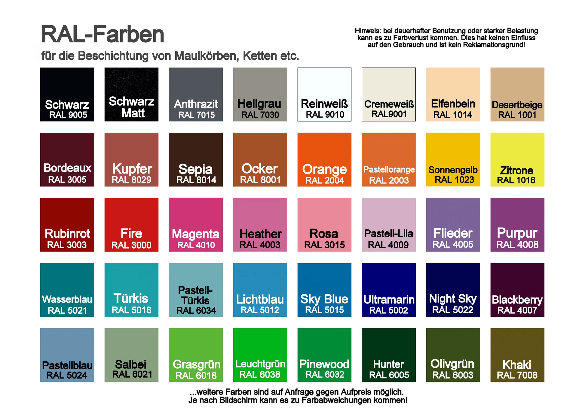 Beachte jedoch: Auch wenn eine Pulverbeschichtung grundsätzlich stoß-, kratz- und schlagfest ist, hat jedes Material seine Grenzen. So kann diese bei Belastung (zB. durch die mechanische Reibung der einzelnen Glieder aneinander) oder dauerhafter Nutzung beschädigt werden. Es entsteht ein "Used"-Look. Bei Kettenhalsbändern besteht keine Garantie zur Haltbarkeitsdauer!